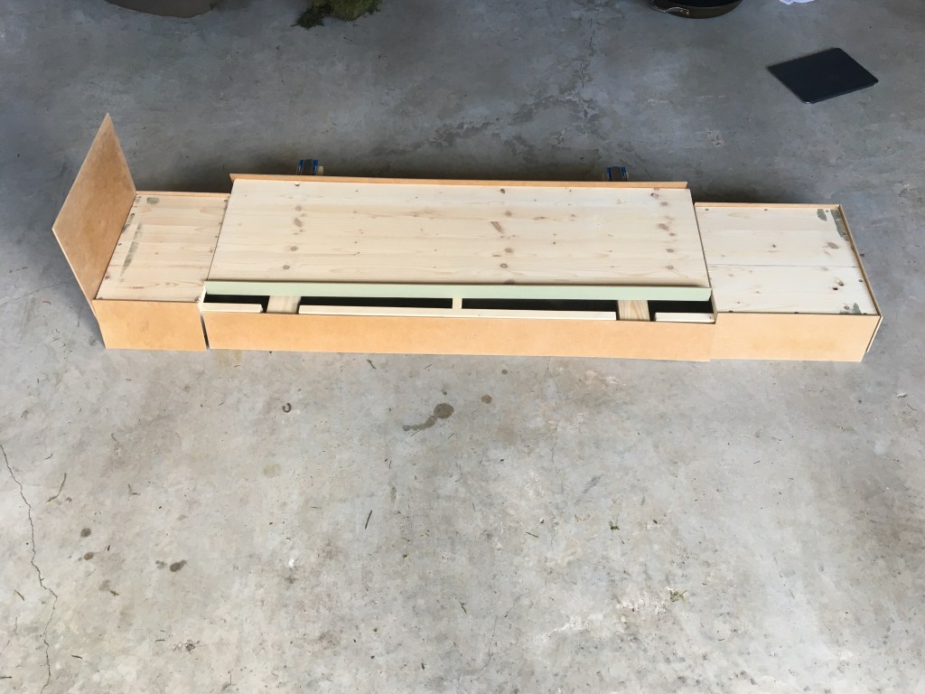 It took me two Saturdays to build it. I made up my own plan but had to build it twice. The first version, seen below, had a 1/4-inch top. During assembly I discovered that the 1/4-inch wood top had a slight twist, which prevented it from lining up on both sides of the table. So I took the whole thing back to the wood shop on Ramstein Air Base and rebuilt it–this time with a 3/8-inch plywood top.