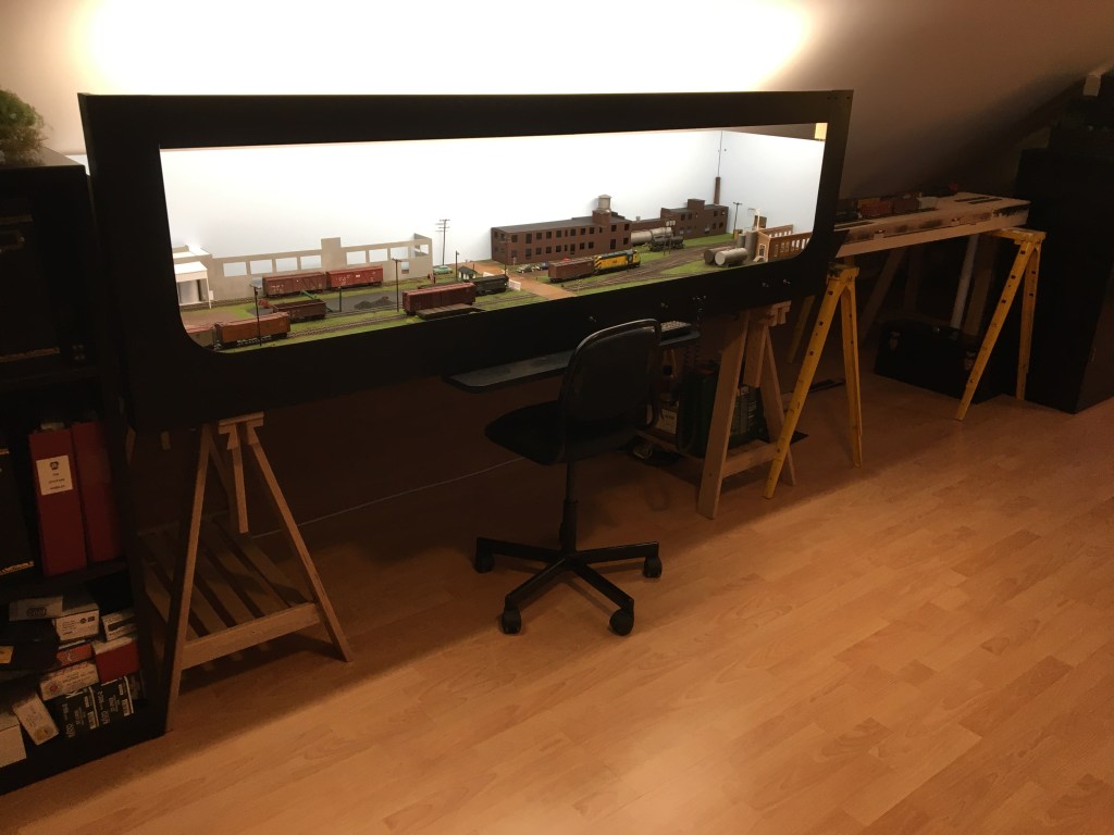 Below. Here’s a photo of Version 2.0 with the 3/8-inch plywood top, taken one week later. You wouldn’t believe how much fiddling was required to get the table level on both ends. I used lots of shims of various thicknesses to get the table as level as possible for tracklaying.