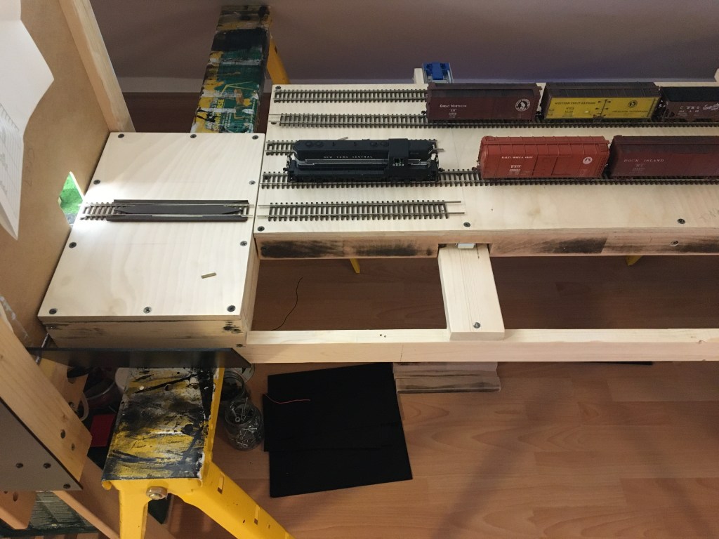 And finally, one last traverser photo, below. This was definitely worth my time and trouble. It cost about $100 up to this point, and that includes all the wood and time I had to pay for at the base wood shop ($12.50/hr). I would’ve spent that much just on turnouts for a traditional staging yard. The traverser is incredibly versatile. I’m glad I built it.