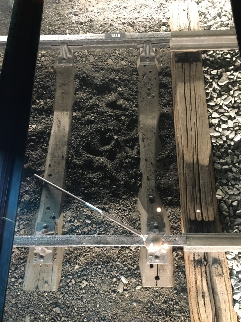 This track display was excellent. This short section of track includes a variety of individual displays of track from different eras, from the 1830s to today. Along the walls are all kinds of tools and equipment, signals, and signs. And like the rest of the museum, this display it dramatically lit and there are videos everywhere showing equipment in action. The section show below, on the left, is original track from the mid-late 1800s.