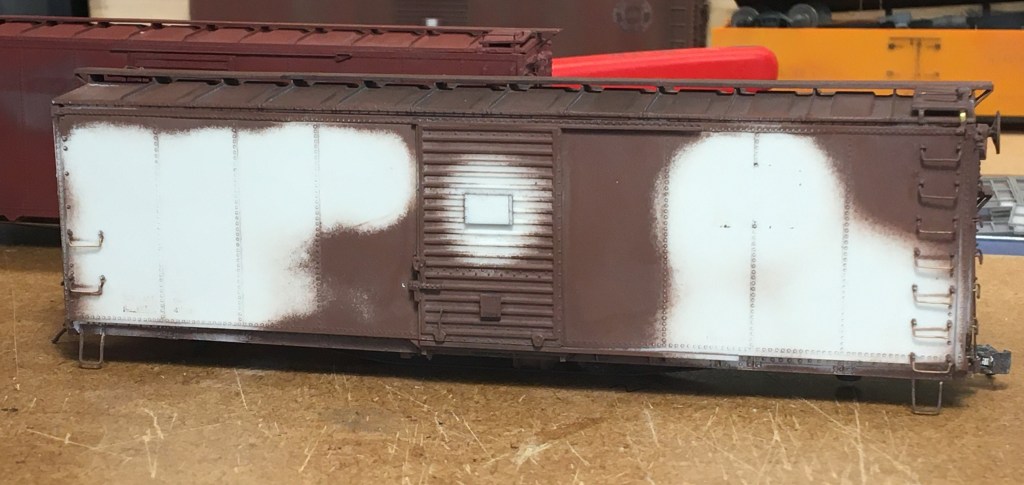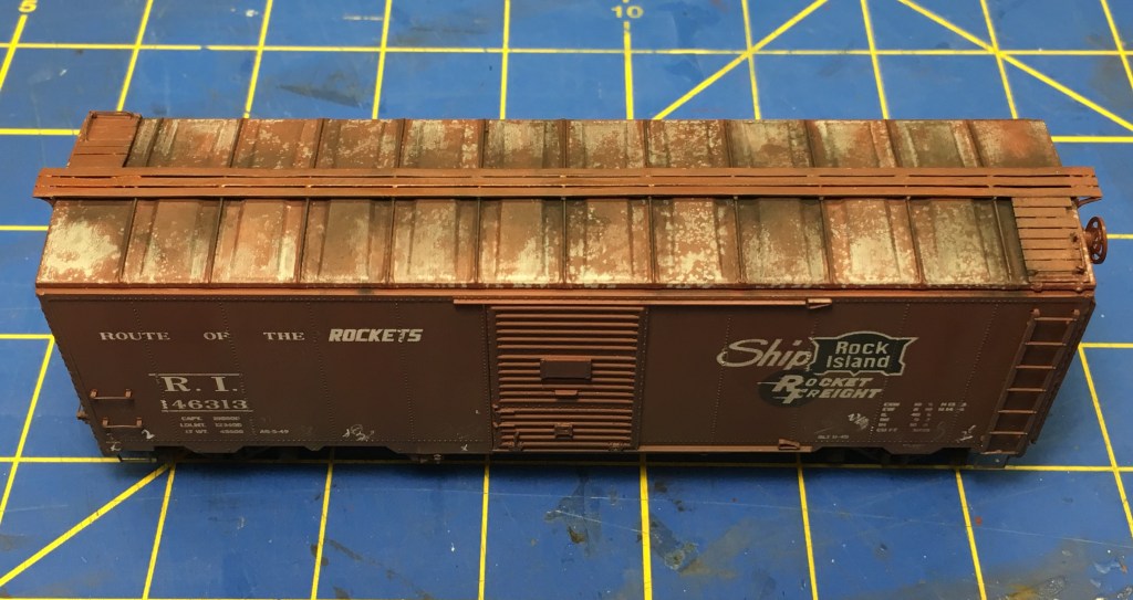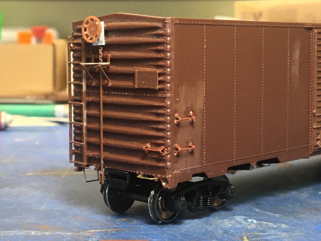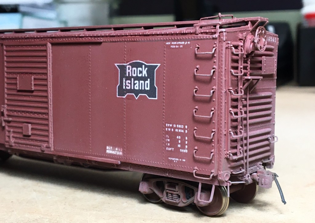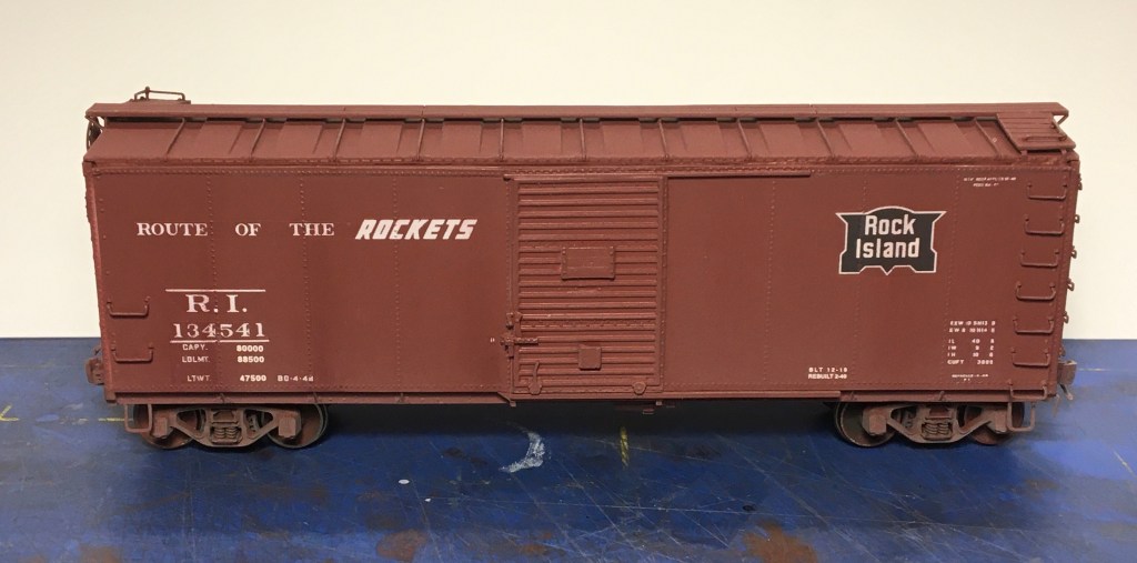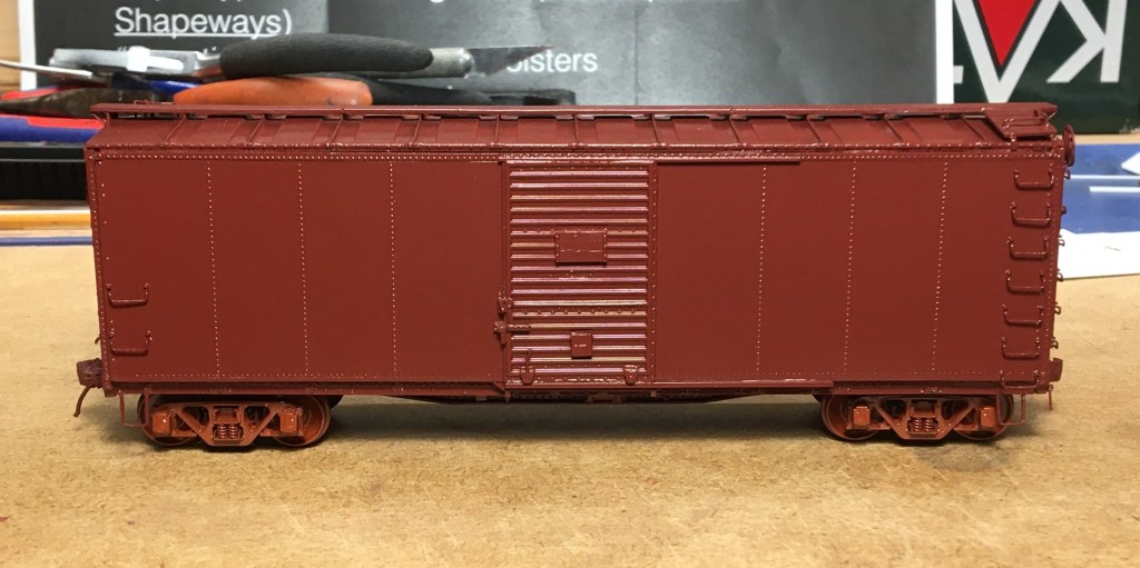 And here we are after painting. I’m using Tru Color RI Freight Car Red, TCP-197 Rock Island 1930-60’s Freight Car Brown, thinned about 30% with Lacquer Thinner. Again, a technological leap over Scalecoat, in my opinion, with the added advantage that Tru Color is dry and ready for decals in 60 minutes.