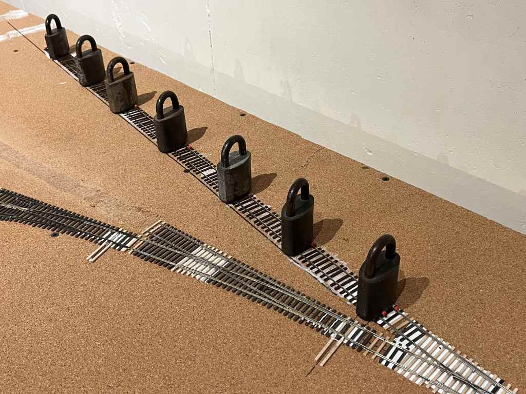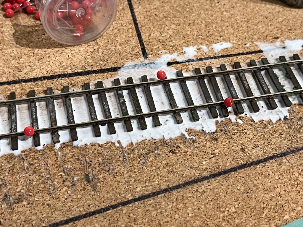 Here’s the recycled track, going into the grocery warehouse lead. I spread Elmer’s white glue (not school glue) on the cork roadbed and pinned the track into place. The pins keep the track straight and on the proper alignment. Note the irregularity of the tie spacing. That’s the result from cutting the webbing from underneath the ties and spreading them out a little.