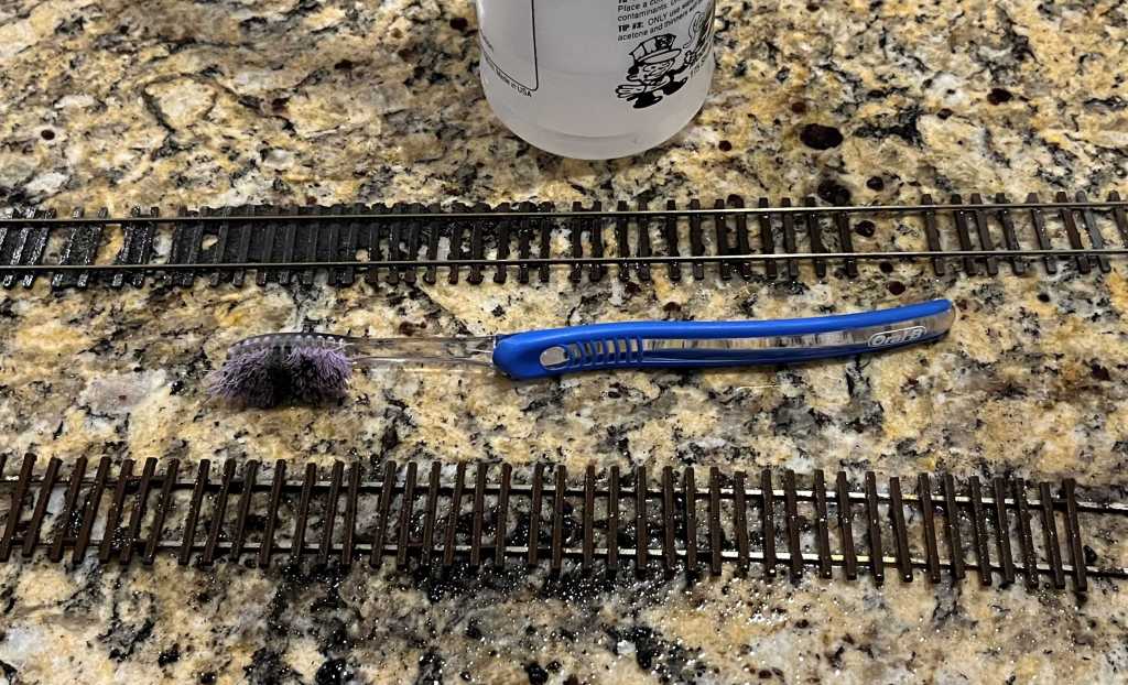 I washed all the gunk off the track, then hit it one more time with the alcohol, and then used a medium-stiffness brass-wire brush to remove any remaining ballast on the bottom of the ties and on the side of the rails. I bought this particular brush in Germany but I’m sure there are many like it at Lowes or Menards.