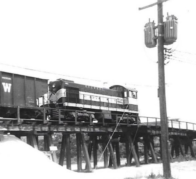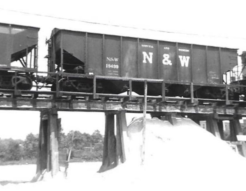 Below. A few months ago a modeler friend, Robert Hultman, saw the blog and sent generously some photos of a neat bulk unloading trestle just a block away from the brewing company at RF&P’s Bolton Street Yard. Robert sent a lot of photos; here are two, which show an RF&P Alco S-2 working cars dumping sand or gravel. I wish I had room for something like this.