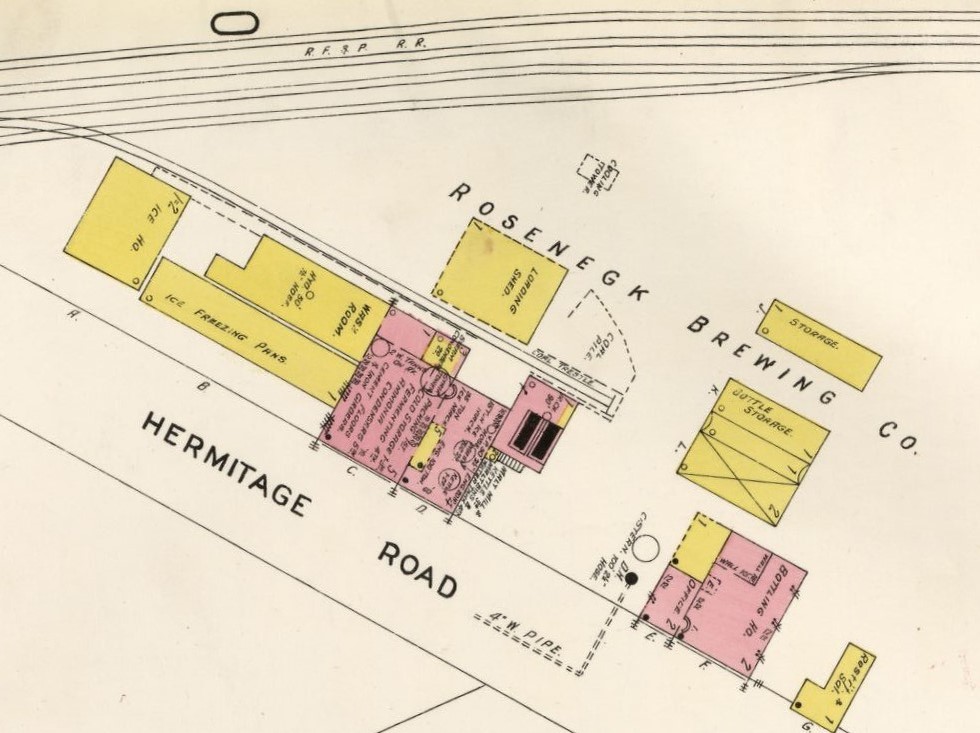 For the second “industry-to-be-named-later” on this track, I’m considering modeling the old Rosenegk Brewing Company. Rosenegk was on the RF&P, a few blocks away from the SAL main tracks–but it was actually on Hermitage Road as you can see below.