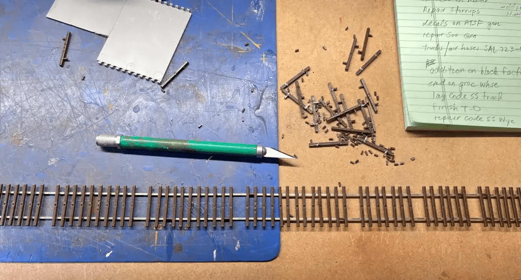 Below. Here is new M.E. flex track being prepared for the other industry leads. In this photo the webbing between the ties is being removed. It’s a tedious process, but it allows irregular realignment of the ties, as shown above, which enhances the effect of track that has seen a little less maintenance.