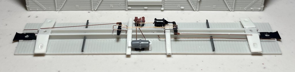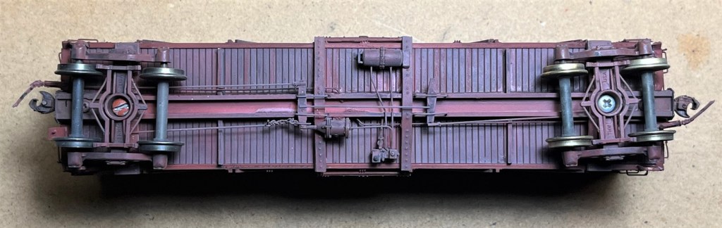Below. Here’s a photo of the completed underframe. I forgot to photograph it during assembly; here’s a view after the car was completed. This view also shows that I used Kadee #178 coupler boxes on the model, and Tahoe 40-ton trucks, and Hi Tech air hoses with brass brackets. It also appears that I used two different brands of “Code 88” wheelsets–see how the truck on the left has wheelsets polished to silver, and the one of the right has wheelsets polished to some other color??