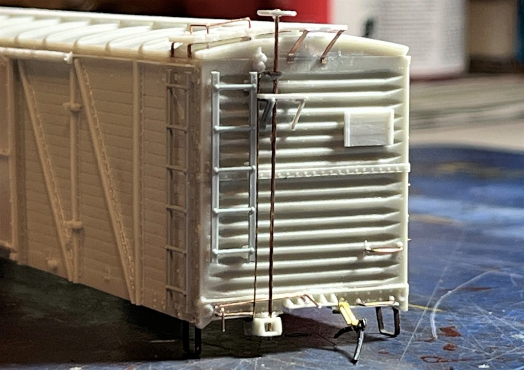 The last assembly completed was the B end. I finished the model per the instructions and used the prototype photo included in the instructions as an additional guide. The ladders are old Details West parts included int he kit. The air line attachment is a brass Hi-Tech details part. The sill steps are by A-Line, and the running board supports are by Yarmouth. It was a straightforward build; fairly easy since attaching a “stemwinder” brake wheel usually goes a lot faster than a power brake housing.