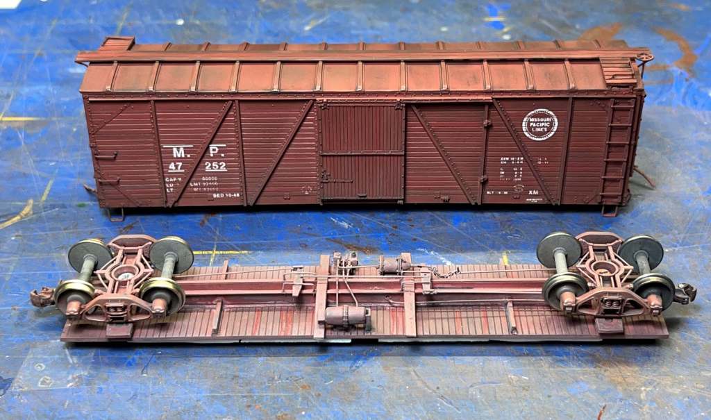 When construction was complete I sandblasted the model in my North Coast sandblast booth, and after I washed it and set it aside to dry, I painted it with Tru Color MoPac Freight Car Red.
