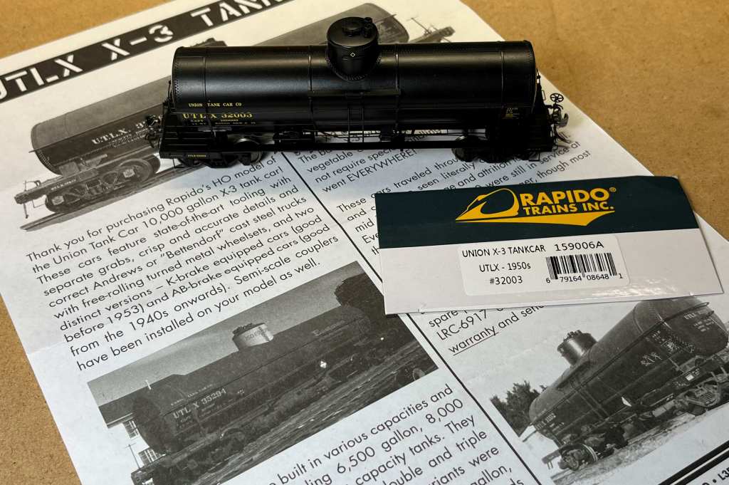 Here is another new model received at about the same time, below. This is one of the new Rapido UTLX X-3 8,000-gal tank cars. It is gorgeous. I’m working on it this week, adding placards, new trucks, and a few more things to really sweeten it up. Well done, Rapido!