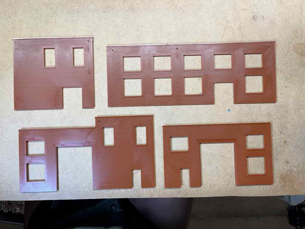 Here are the major kit components. The building will be placed between two roads with the back end against the backdrop, in a space fourteen inches long and five inches deep.