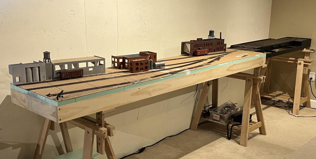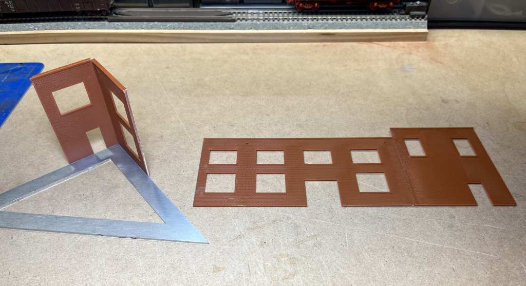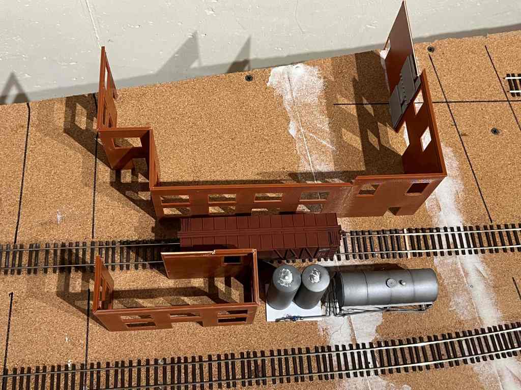 Below. After much time and testing, and measuring and gluing, here’s how the building took shape. Note that the track goes between the buildings. I like this layout as trains will disappear between the buildings for a short time, and cars will be spotted out of sight. Like the previous version of Alcatraz, I also plan to have pipes and wires going overhead between the buildings.