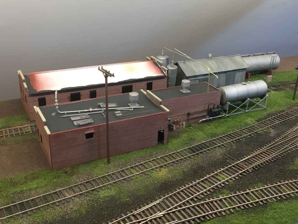 Below. An overhead view of the building layout. The building sits between two roads which are drawn on the subroadbed. The tanks are from the Walthers Cornerstone Industrial Storage Tanks set, kit number 933-3514.
