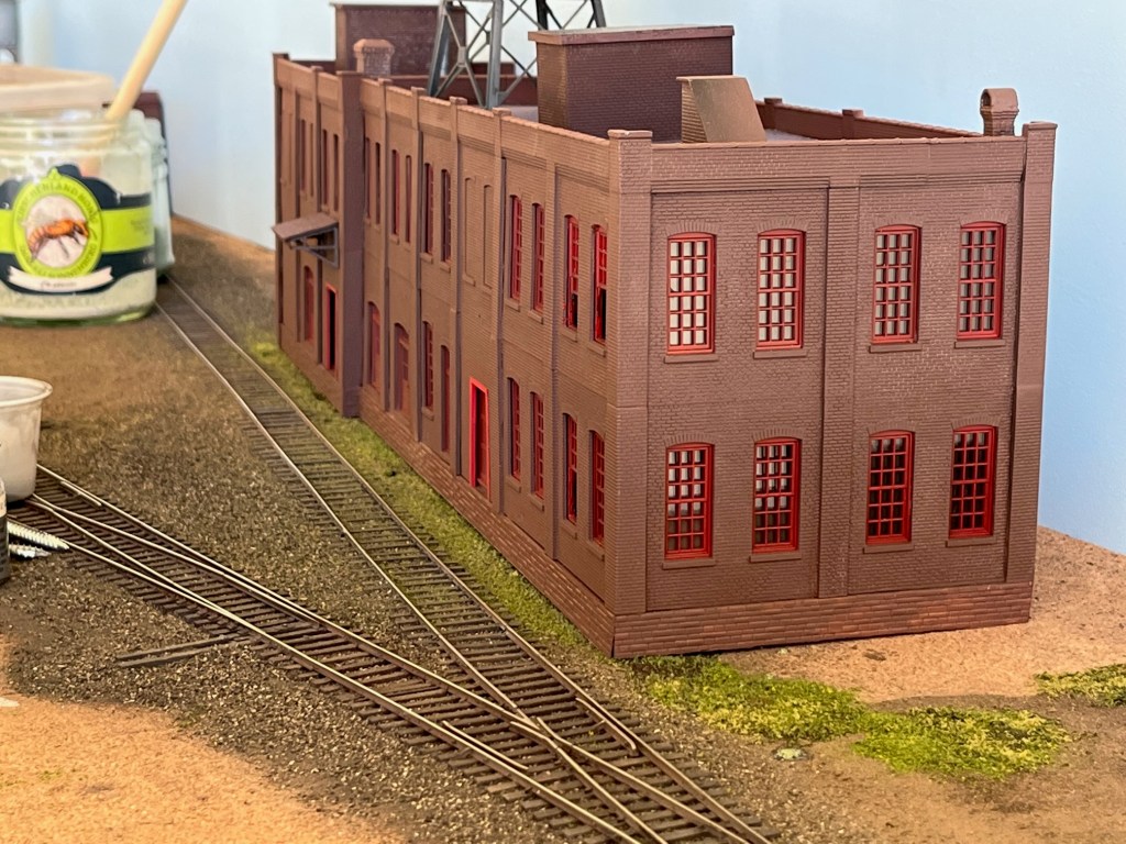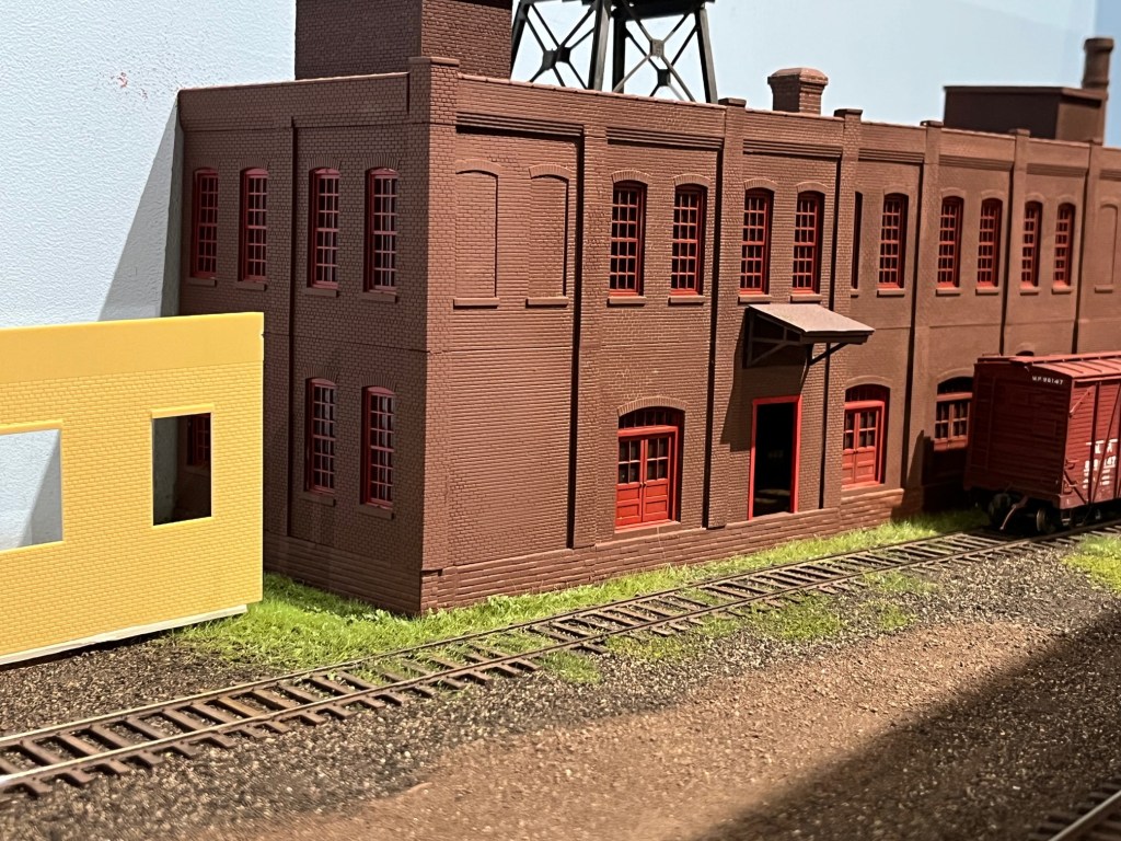 My friend Jeff Halloin sent a very inspiring photo from his Litchfield & Madison layout. He’s using pre-made scenic mats on either side of the tracks, and static grass in the back. It looks great. He’ll fill in some of the area in front of the backdrop with a scale cornfield. This isn’t the scenery I want for my industrial layout, but Jeff’s use of color contrast and texture contrast is second to none.