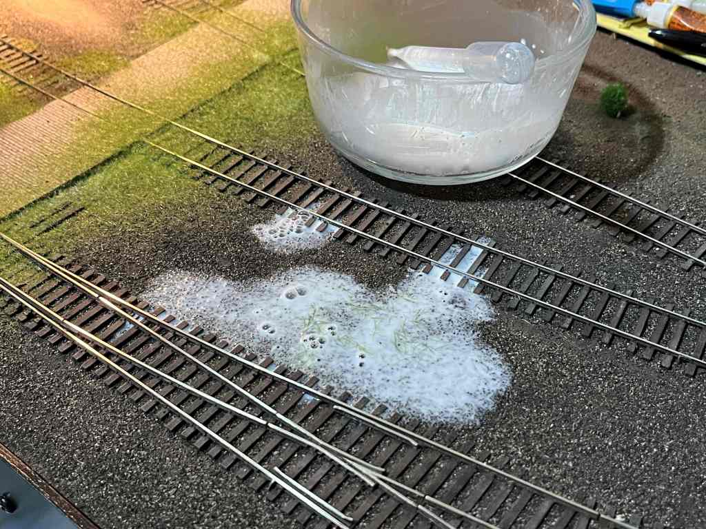 I glued static grass down using the same mixture used for ballast: 50% Elmers Glue, 50% water, a splash of 70% rubbing alcohol and a few drops of dish soap. I thoroughly mixed this solution to a consistency of whole milk and apply it using a pipette.