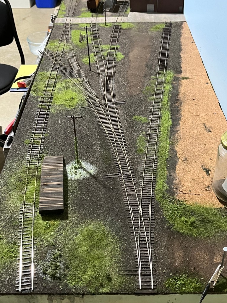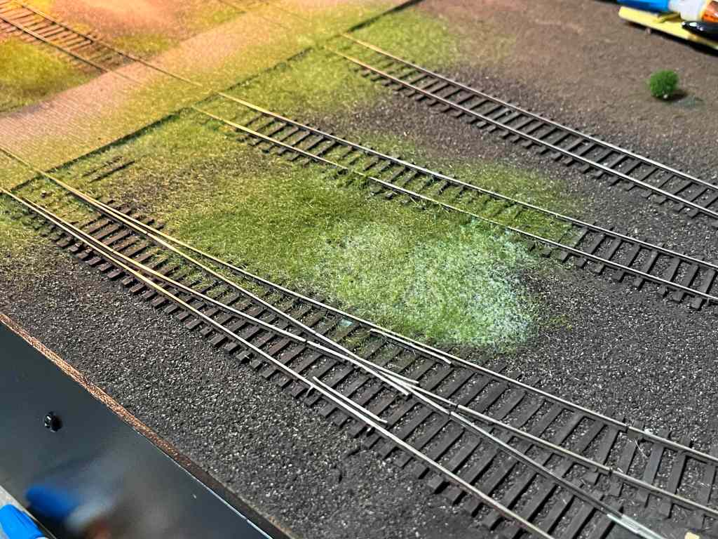 Prior to leaving for Belgium, I started scenery work on the layout. I laid down some static grass and other material to make the layout more “complete”.