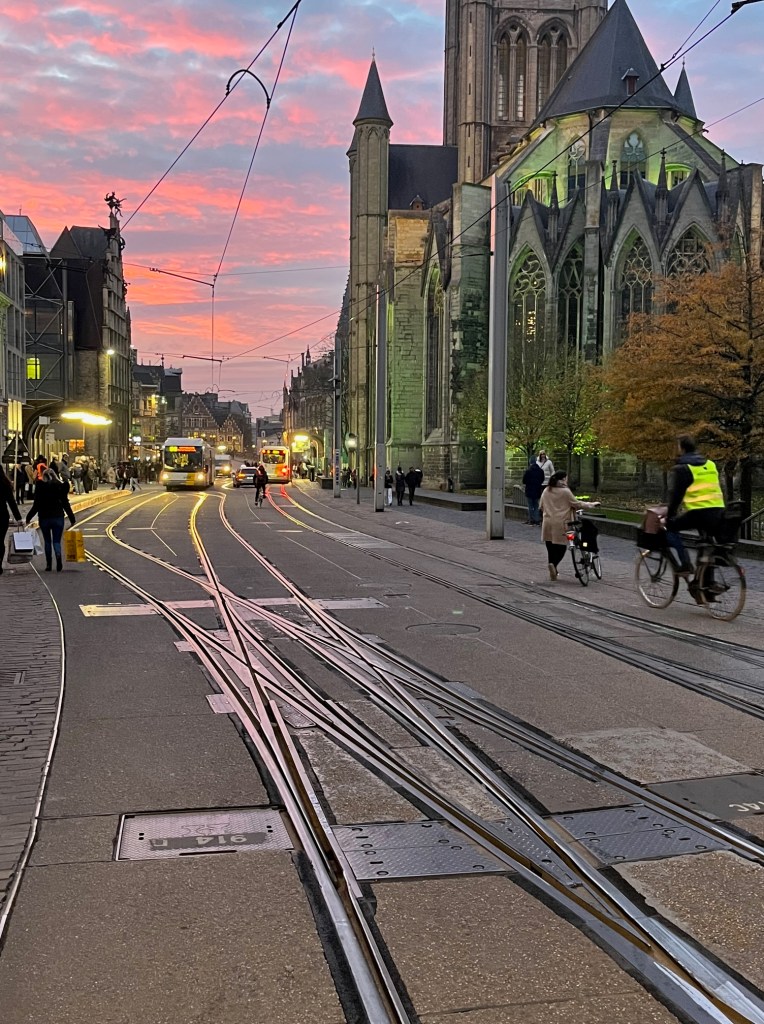 Unlike Brugge, Ghent has a tram system throughout the city. Complex track and crossings are common in Europe, but the photo below shows something extraordinary: a double-slip turnout right in the middle of the main avenue through downtown. There are several of them within a half a mile in Ghent.