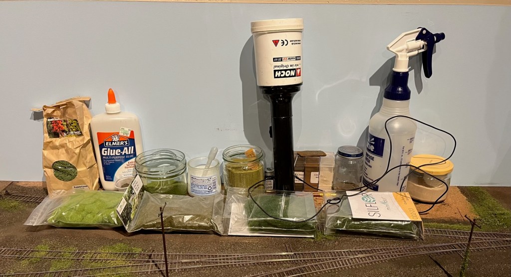 It is really easy for me to overdo static grass, so I take my time and do a little bit at a time, and come look at it again the next day and then decide if I want to add more. The scenery process below took three weeks, about a half an hour each day–and remember my layout is only eight feet long.