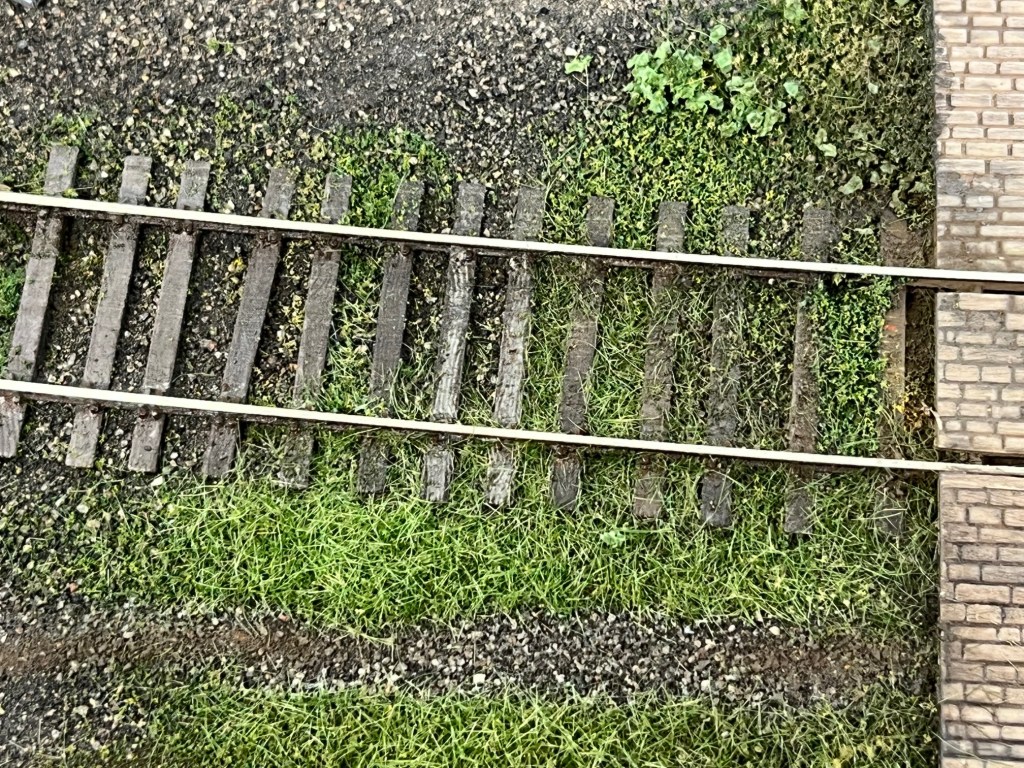 Before I put down any scenery I took a long look at the layout to determine what I wanted to accomplish. I wanted ground cover around a few, but not all of the buildings, along the roads, and in a few places around and between the rails. I wanted much of that beautiful ballast work to show through, and a lot of the tie weathering to be seen.