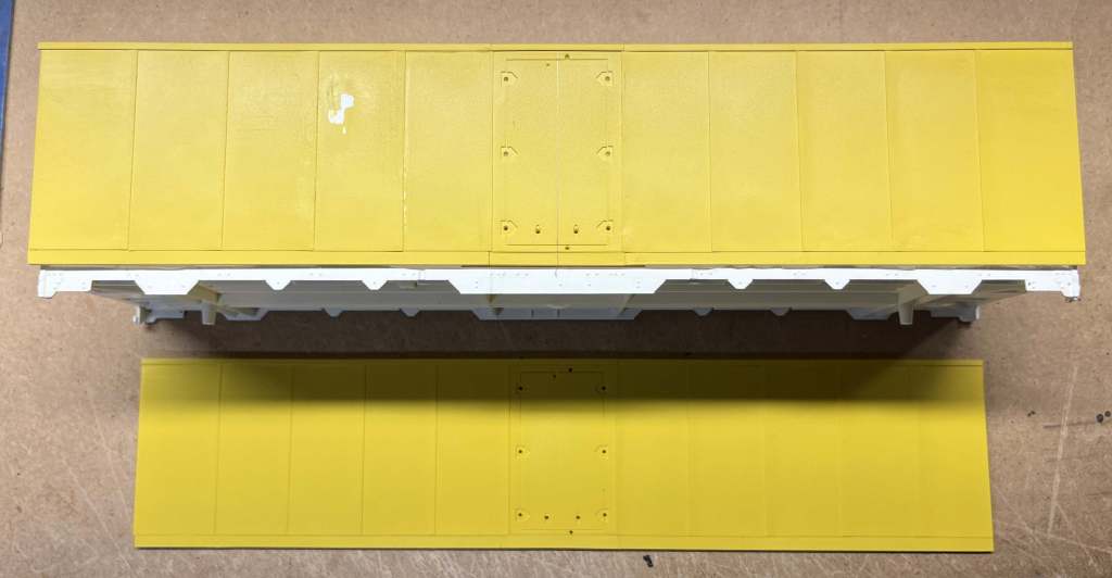 My modeling plan is to remove the sides from an Intermountain reefer body and replace them with scratchbuilt sides with the correct panel configuration. Here’s an in-progress shot, below. I cut out the reefer door out of the Intermountain car and built new sides out of .060 styrene sheet. I overlaid five .005 styrene panels on each side of the door, like the prototype cars.