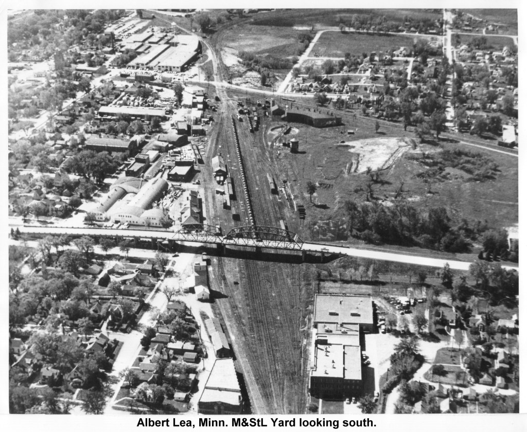 M&StL’s small terminal in Albert Lea is seen below around 1950. Louie had an engine house, a small, active yard, plenty of industry, multiple interchanges, and shared running with the IC. The photo below is from the Doug Harding collection, looking south. The depot can be seen on the left by the overhead bridge.