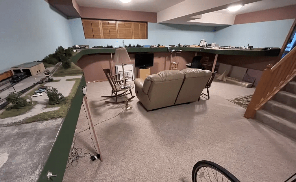 Below. Barry famously models the Monticello Railroad Museum plus former Illinois Central trackage in and around Monticello. Here’s Barry’s basement den, which contains the majority of his expansive layout. This area is probably 25 x 30 feet, maybe more.