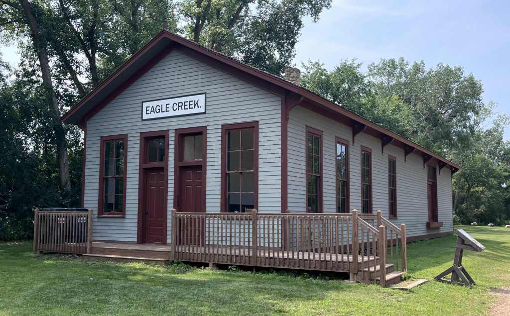 Undeterred, I drove all about an hour to a little place called Murphy’s Landing, in Shakopee, to visit the former Milwaukee Road Chaska depot there. Here’s a photo below. The station sign now says Eagle Creek because the depot was moved to a village along the Minnesota River called Eagle Creek, but it was originally on the Milwaukee Road’s Hastings and Dakota Division main track through Chaska.
