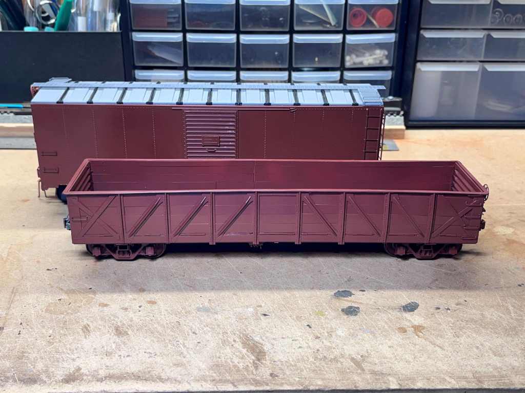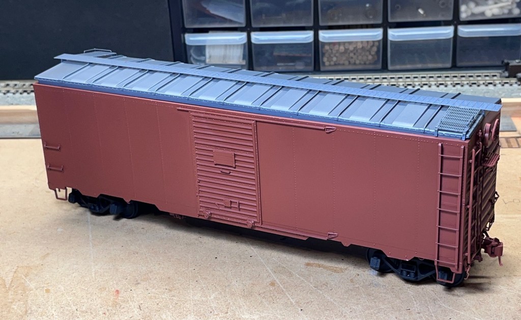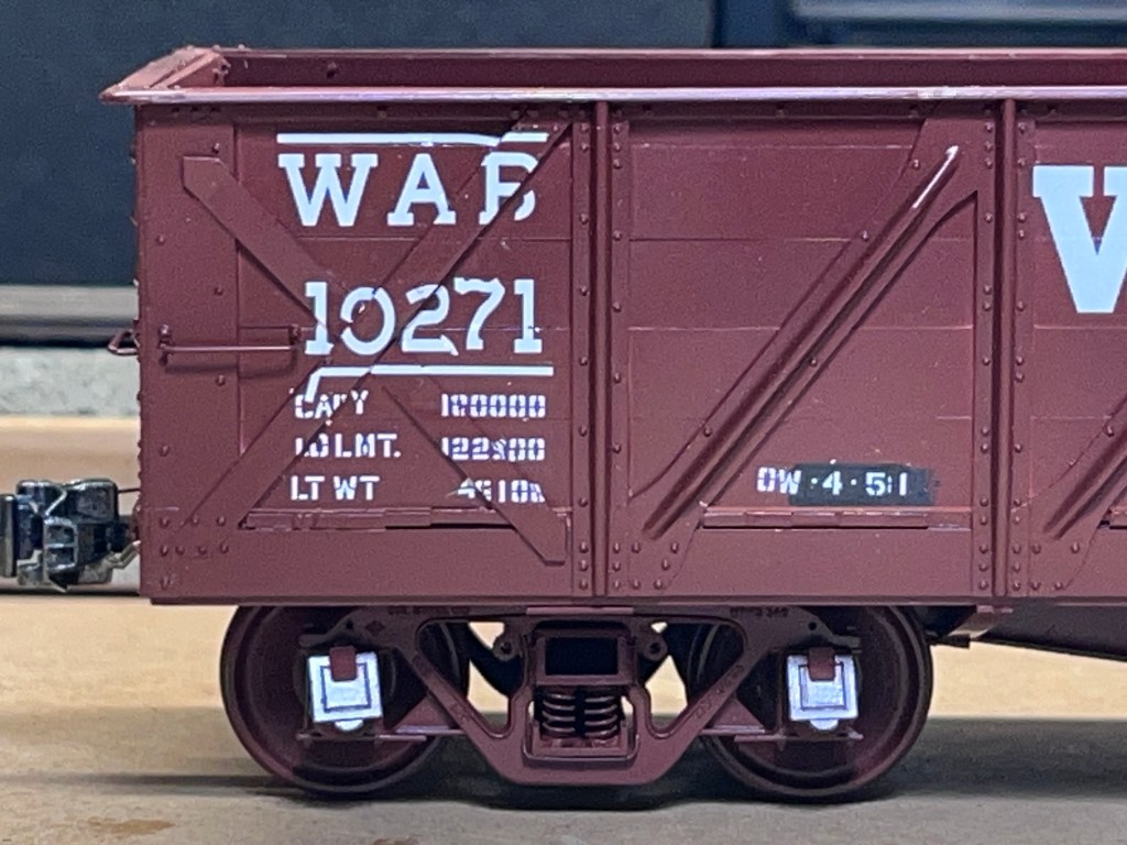 Below. Once the build was finished, I sandblasted the entire model and painted it with Tru Color CMO Freight Car color. I was agonizing over the Wabash car color but the Wabash experts told me to weather the car pretty heavily and nobody would criticize.