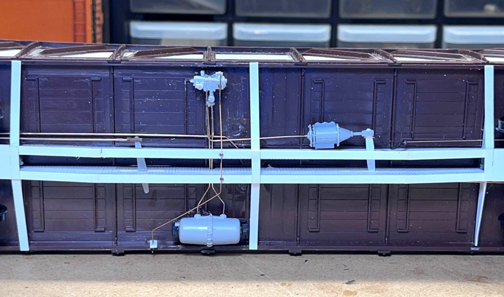 With no guidance from drawings, I decided to install AB brake gear. I doubt these cars ever had AB gear since they were gone by 1953 or 1954. However, all I had on hand was a San Juan AB set, and they are second-to-none in accuracy and appearance. I installed an air line, the three main brake components, and all the piping but omitted piping for the retainer line. I also installed a cut-out lever for the valve which you can see spanning across both sides of the car.