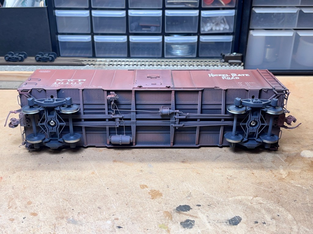 Below. Here’s a view of the underframe after sandblasting and painting. The fishbelly underframe, trucks, and all the details blend together nicely.