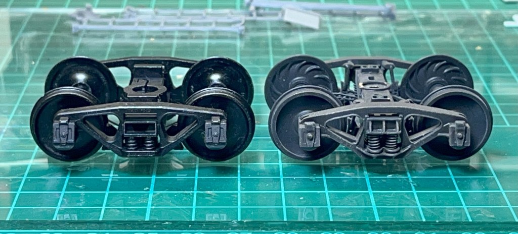 Another improvement was the trucks. Tony was kind enough to send me a pair the new Kadee Proto48 Barber S-2 trucks for this model. One of these new trucks is seen on the left, below. On the right is a Protocraft ARA Double-Truss truck for comparison. The Kadee truck is made of Kadee’s patented High Grade Compound (HGC) material, while the Protocraft truck is brass.