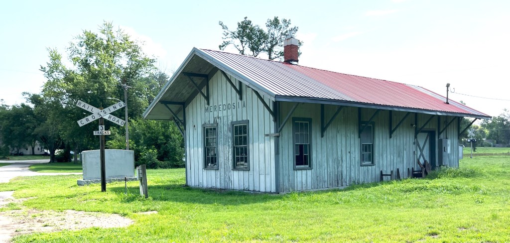 The first thing I did was a little field research. In July I took a day off from work and drove two hours north from my home in O’Fallon to Bluffs, Illinois, and followed 40 or so miles of the line northwest to Timewell. Tony had a few questions about topography and industries in a few of the little towns. Most of the line was torn up in the 1980s but there are still a few things left, including the depot at Meredosia, where the line crossed the Illinois River (below):
