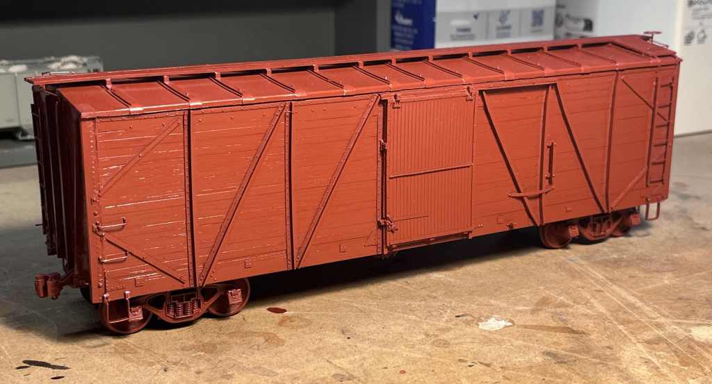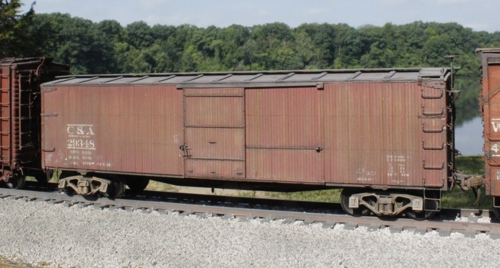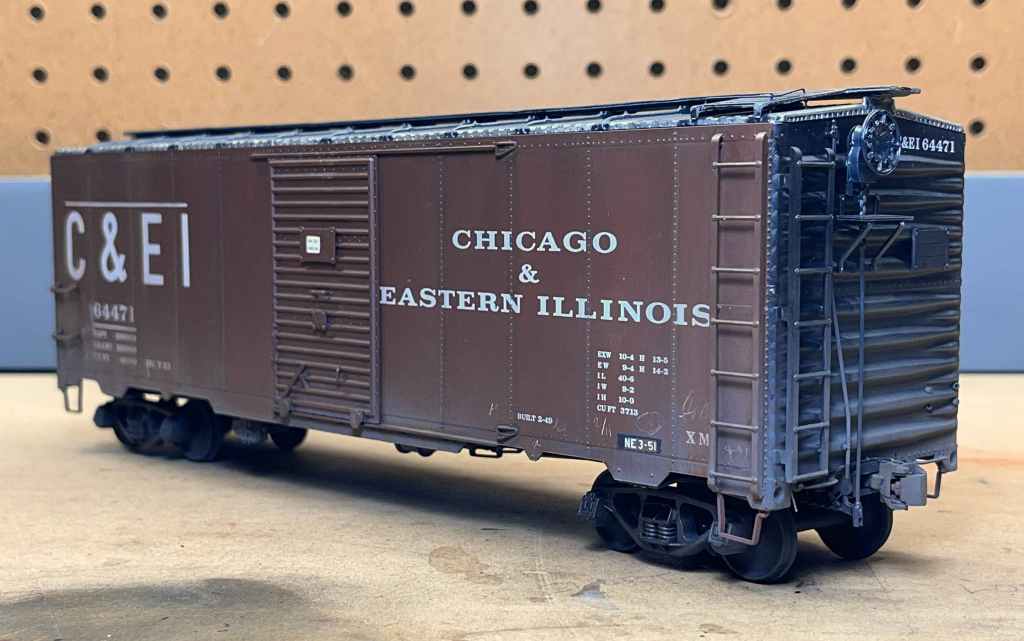 I finished one more car just before moving to Germany in January 2025, and that was an ordinary Intermountain 1937 box car, factory painted C&EI that Tony sent me a month earlier. An in-progress photo of the car is seen below. This was the first model on which I used the then-new Kadee Prot48 trucks (#756 AAR Bettendorf Style 50-ton trucks). They look and work great. As for the rest of the car, I made a few quick upgrades–nothing too time-consuming–then weathered it all around, and finally dispatched it to it’s new railroad.