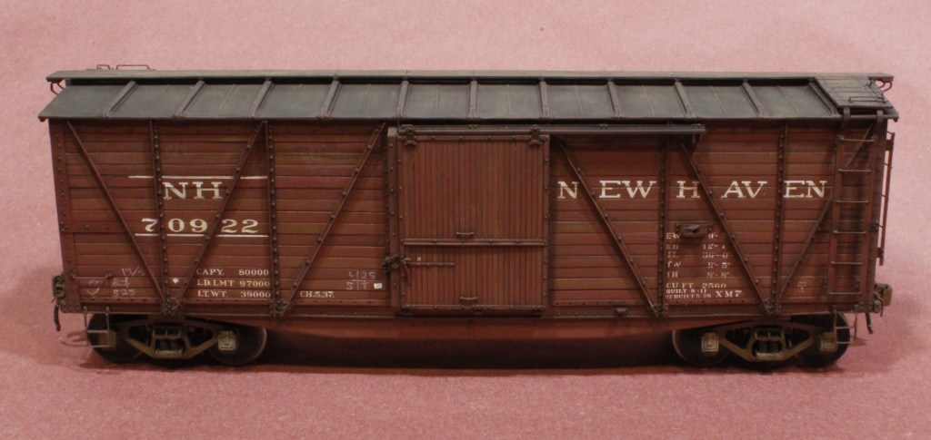After moving and getting settled–which took four or five months–I began work on two O scale models of my own. The first is this Rails Unlimited Milwaukee Road single-sheathed box car, seen below. It was an easy build except for the stirrups, which I made out of brass and were a real pain to fashion, drill out and install. The trucks are Protocraft Dalman per the prototype. Here’s where the car stands today.