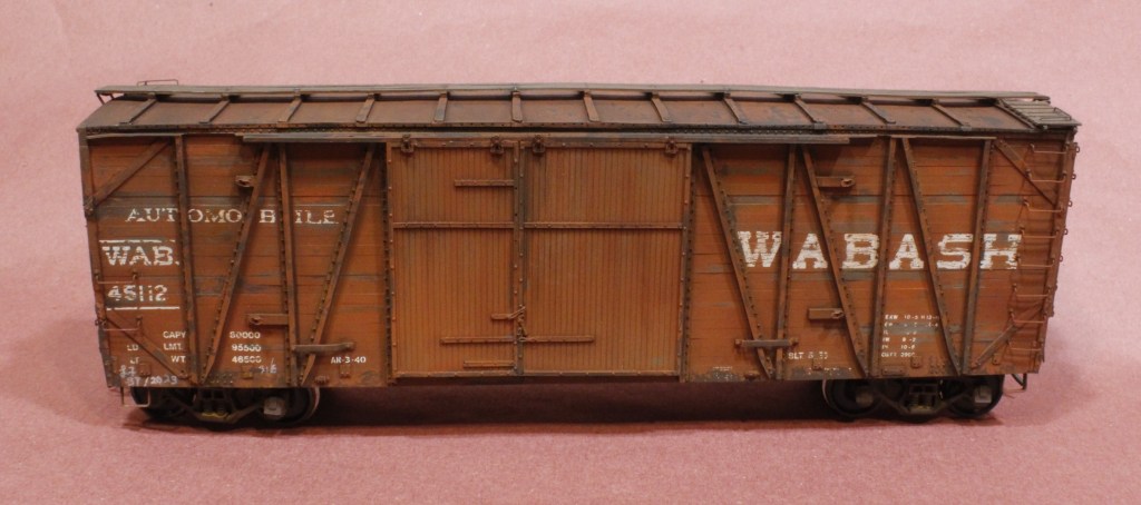 About the beautiful, scratchbuilt Wabash auto car below, Lee wrote The painting project on this (as with most other cars) began with finding a color image of a pleasingly weathered single sheathed car. I found a photo of a nicely-weathered Central Vermont car and from there I just tried to duplicate the pattern of peeling paint and weathered wood on the image. Weathering on the Wabash car siding was done using an old trick of dabbing on rubber cement over a weathered wood color, then spraying the car color and removing the rubber cement with a fiberglass eraser. Much better methods have come around since then, and one of the unexpected drawbacks was that the bits of rubber cement that weren’t removed dried up and turned to a white residue after 30-some years. Fortunately, the residue came off with a stiff bristled brush. The weathered peeling and chipped lettering was done by using CDS dry transfers instead of decals and then using the fiberglass eraser to weather the lettering. This technique really only works well with dry transfers as water slide decals with come off in unnatural chunks instead of small chips.