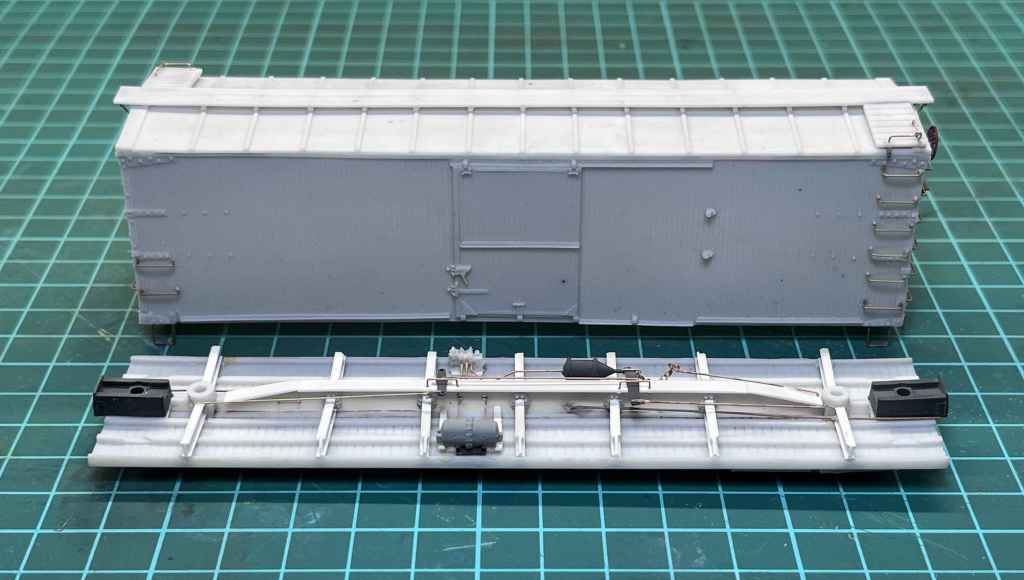 Below. There was nothing special about the build. I followed the instructions and referred to prototype photos to get the paint and details right. Here’s the finished “build” after four hours of work. I equipped my model with AB brakes per the Westerfield instructions, using a reservoir from a Tichy AB Brake gear set, and cylinder from a Cal Scale AB brake gear set and a leftover valve from a Resin Car works model. Brake rigging is Tichy .0125 wire. The coupler boxes are Kadee 178. I also used Yarmouth etched parts to mount the latitudinal running board and the running board ends. Sadly those parts are no long available. The air line mount is a Hi-Tech Details part, and the nut-bolt-washer castings are from Tichy.