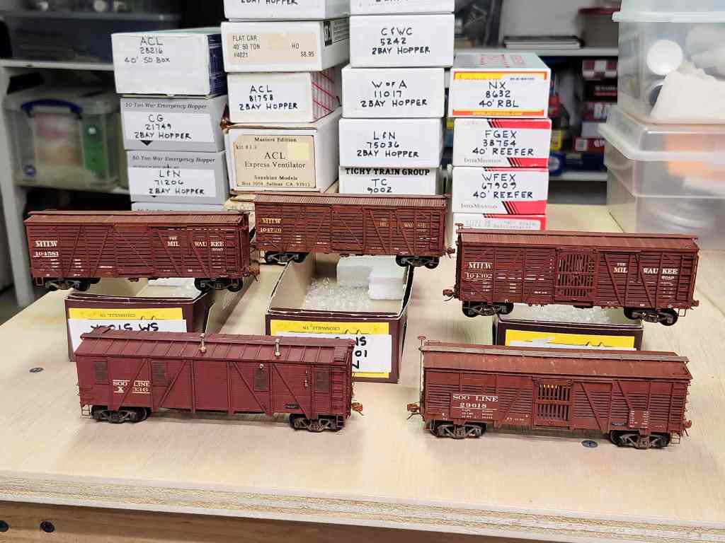 Tom wrote I finished three Westerfield Milwaukee stock cars, one Yarmouth Soo Line stock car, and finally one Northwoods Models Soo Line Bunk Car. The bunk car is the funky one with the sawtooth bottom and the windows cut in.