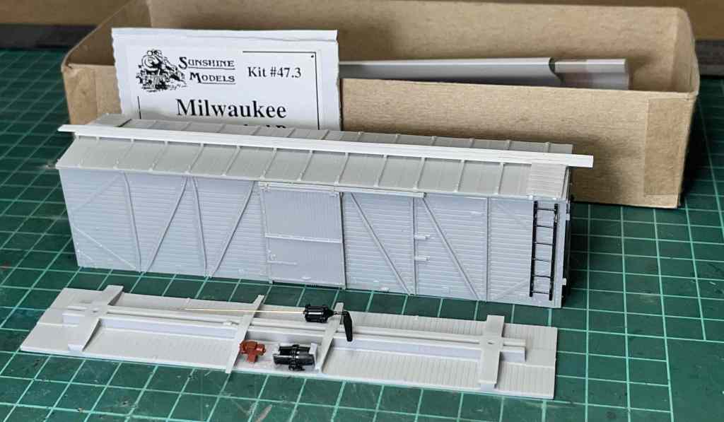 Brian’s work motivated me to finish two Milwaukee single-sheathed cars I had been passively working on for some time. The first was this Sunshine Models single-sheathed box car kit. I only took one photo during construction, seen here. It is one of my last Sunshine kits still new in the box.